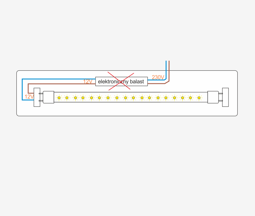 - W przypadku świetlówek zasilanych jednostronnie, zmieniamy sposób zasilania tak, że przewody 0 i faza są podłączone do jednego gniazda (z zachowaniem podziału aby nie doprowadzić do zwarcia).