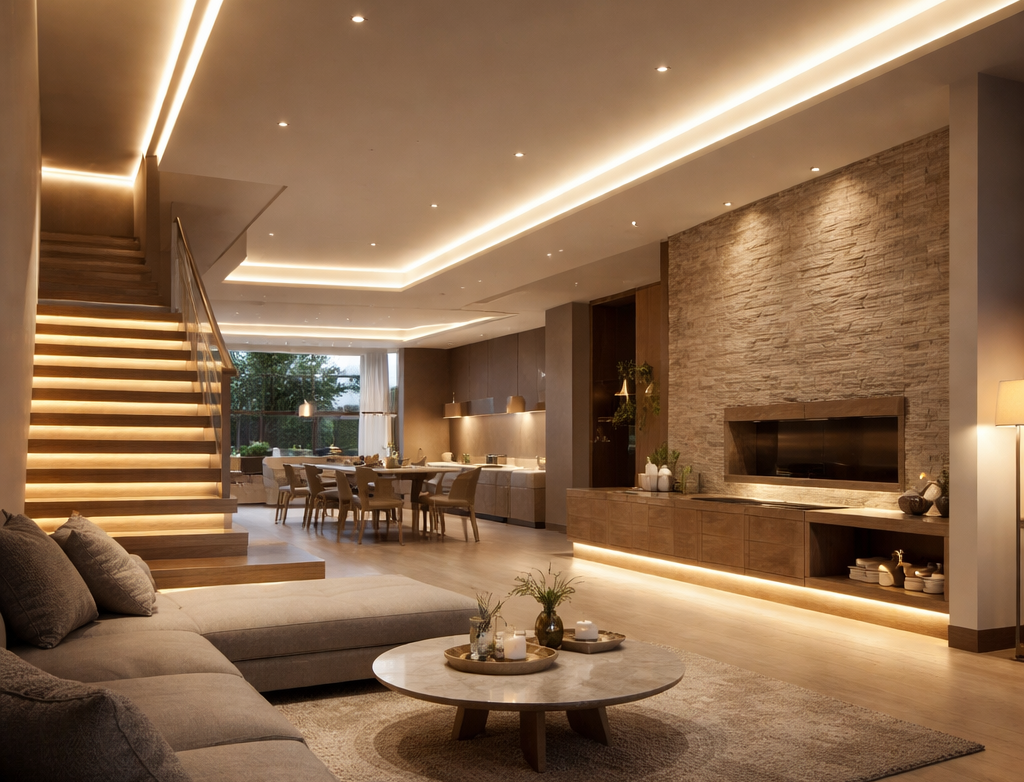 Oświetlenie to jeden z kluczowych elementów każdego domu – wpływa nie tylko na wygląd wnętrza, ale także na komfort codziennego życia. W KINGLED pomożemy Ci zaplanować oświetlenie już na etapie projektowania budowy. Wystarczy, że na samym początku wyślesz do nas swój projekt, a my zajmiemy się resztą.