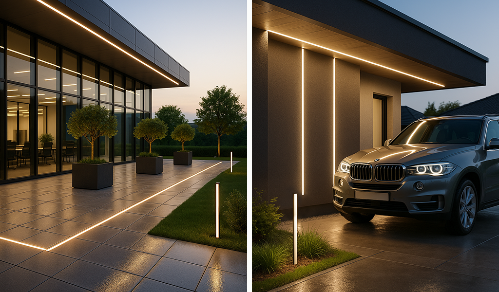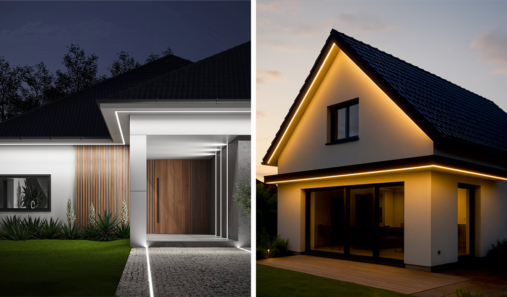 W zastosowaniach zewnętrznych oprawy AQU służą do dekoracyjnego podkreślania bryły budynku. Można je montować we wpustach na elewacji, tworząc ciągłe linie świetlne wzdłuż krawędzi ścian, gzymsów czy obramowań okiennych. Popularnym zabiegiem jest montaż AQU w poziomych boniach (rowkach dekoracyjnych) fasady – nocą cały pas wokół budynku emituje miękką łunę, nadając nowoczesny, high-tech wygląd domu lub biurowca. Ze względu na pełną odporność na warunki pogodowe (deszcz, śnieg, pył, skrajne temperatury) oprawy te mogą być stosowane bez obaw na zewnątrz. Ich ciągła linia światła nie oślepia obserwatora (w przeciwieństwie do punktowych reflektorów), a raczej akcentuje formę architektury – np. zarys schodów wejściowych, kontury tarasu, pergoli, itp. W odróżnieniu od taśm LED w osłonie silikonowej, AQU nie ulega degradacji na słońcu ani rozszczelnieniu, więc sprawdzi się na długie lata w zabudowie elewacyjnej. Co więcej, montaż w boniach z użyciem profilu montażowego zapewnia, że światło jest emitowane idealnie równo, a sama oprawa jest niewidoczna w ciągu dnia. Architekci doceniają AQU za możliwość realizacji śmiałych wizji – np. świetlne linie biegnące po powierzchni całego budynku, łączące się pod różnymi kątami, co wcześniej wymagałoby użycia setek pojedynczych opraw lub giętkich neonów LED o słabszej trwałości.