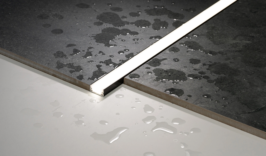 Montaż bezpośrednio w szczelinie (na silikonie/kleju) – to najprostszy i najczęściej stosowany sposób, szczególnie we wnętrzach (łazienki, kuchnie, SPA). Polega on na wklejeniu oprawy AQU w przygotowany rowek lub przerwę między płytkami za pomocą kleju montażowego bądź silikonu neutralnego. Dzięki wysokości 8,5 mm, zgodnej z grubością typowych płytek, oprawa po wklejeniu tworzy z nimi równą powierzchnię. Po utwardzeniu kleju/silikonu całość staje się integralna z podłożem – można po niej chodzić, myć podłogę, a wilgoć nie dostaje się pod spód. Taka forma montażu sprawdza się nie tylko w podłodze, ale też w ścianach (np. pionowe pasy świetlne w prysznicu) czy sufitach podwieszanych – wystarczy wykonać wąskie frezowanie o szerokości ~20 mm i głębokości ~9 mm, by osadzić w nim oprawę do równej powierzchni. Zaletą metody jest brak dodatkowych elementów – oprawa jest praktycznie niewidoczna, gdy jest wyłączona (zlewa się z powierzchnią), a po włączeniu ukazuje się czysta linia światła.