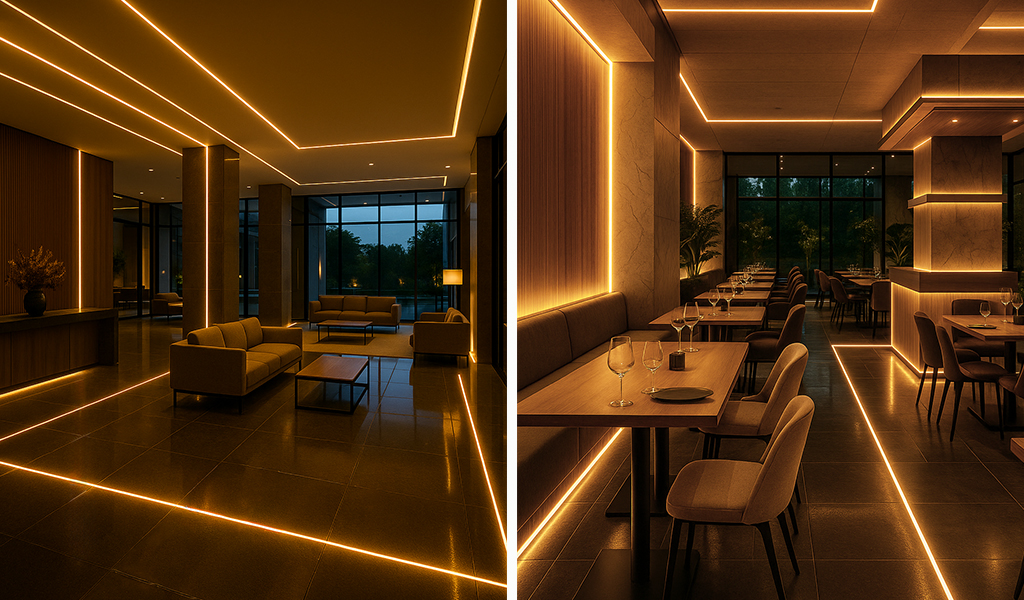 W obiektach komercyjnych oprawy AQU pełnią rolę zarówno dekoracyjną, jak i funkcjonalną. W hotelach często montuje się je wzdłuż korytarzy przy podłodze, aby dyskretnie doświetlały drogę gościom w nocy (spełniając normy oświetlenia ewakuacyjnego, jeśli są odpowiedniej jasności). Można je też spotkać w luksusowych łazienkach hotelowych czy spa – ze względów opisanych wyżej. W lobby i restauracjach AQU bywa używana do kreślenia linii świetlnych na ścianach lub suficie, tworząc efektowne akcenty świetlne podkreślające architekturę (np. zarysowanie kolumn, wnęk, sufitów podwieszanych). W biurach natomiast oprawy te wpisują się w trend minimalistycznego, zintegrowanego oświetlenia – zamiast widocznych opraw natynkowych, światło wydobywa się z szczelin w ścianach lub podłodze, co daje ultranowoczesny charakter przestrzeni. Dodatkowym atutem w biurach jest możliwość integracji z automatyką – np. po połączeniu z czujnikami ruchu, linie AQU przy podłodze mogą zapalać się przy przechodzeniu osób, co poprawia bezpieczeństwo i wygląd (np. delikatnie rozświetlony korytarz przed osobą idącą). Z kolei w salach konferencyjnych oprawy te mogą służyć jako oświetlenie ambientowe, ściemniane podczas prezentacji multimedialnych, by zaznaczyć obrys pomieszczenia bez rozpraszania uwagi uczestników.
