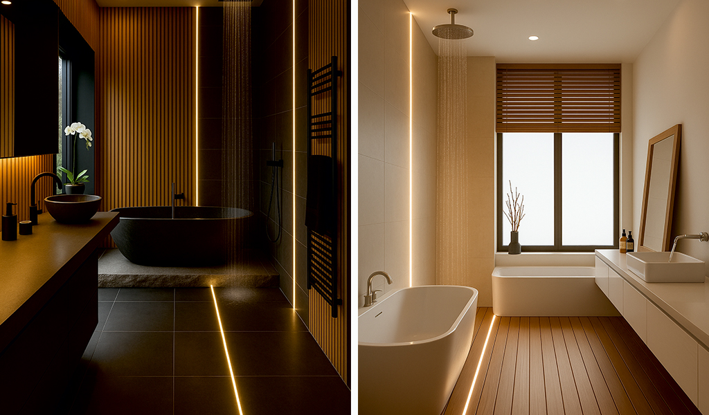 Oprawy AQU zostały stworzone z myślą o użyciu pod prysznicem, przy wannie, umywalce czy na podłodze łazienki. Pozwalają one uzyskać efektowne linie światła wzdłuż ścian lub w posadzce, które nie tylko zdobią wnętrze, ale też pełnią funkcję praktyczną (np. delikatne oświetlenie nocne łazienki nie rażące w oczy). Dzięki pełnej wodoodporności IP68 oprawy te zniosą bez problemu stałe zachlapywanie wodą, a nawet zanurzenie – można je montować wewnątrz brodzików czy odwodnień liniowych, co wcześniej nie było możliwe przy standardowych taśmach LED. Ich antypoślizgowa, lekko gumowata powierzchnia (warstwa żywicy) jest bezpieczna w dotyku bosą stopą i łatwa do utrzymania w czystości. Ciepła barwa 3000K w łazience daje przyjemne, relaksujące światło do kąpieli, natomiast 4500K sprawdzi się przy lustrze czy prysznicu, zapewniając czystsze, jaśniejsze oświetlenie. AQU w łazience to idealne rozwiązanie do nowoczesnych projektów typu walk-in shower, domowego SPA czy minimalistycznych toalet w stylu hotelowym.