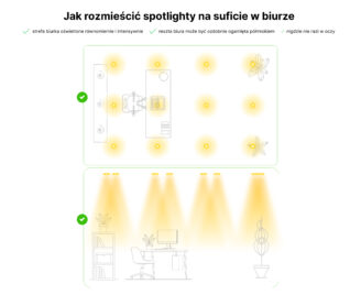 Oprawy LED sufitowe świetnie nadają się do zastosowania w pomieszczeniach biurowych dzięki ich mocnemu strumieniowi światła, małym efekcie lśnienia lampy oraz możliwości wybrania odpowiedniej dla tego typu pomieszczeń barwy. W biurze licząc w przybliżeniu należy zastosować przynajmniej 6W mocy na 1m^2 pomieszczenia, aby uzyskać wymaganą ilość światła czyli ok. 500 luxów na blatach biurek. Pomocne w takim wypadku będzie zamontowanie opraw LED bezpośrednio nad miejscami pracy, aby główny strumień światła mógł paść tam gdzie jest najbardziej potrzebny. Zakładając że pomieszczenie biurowe ma 16m2 powierzchni i posiada 4 biurka do pracy, będzie potrzebne ok 96W mocy, więc należy umieścić w nim minimum 4 panele o mocy 25W każdy, a zamontowanie ich bezpośrednio nad biurkami zmaksymalizuje ilość światła na nie padają. Do pomieszczeń biurowych jedyną barwą światła nadającą się do zastosowania jest barwa biała dzienna 4000K - 4500K. Jest to światło najbardziej naturalne dla ludzkiego oka, organizm czuje się bardzo dobrze i jest gotowy do działania. Taka barwa światła naturalnie pozwala się lepiej skoncentrować na wykonywanych zadaniach i nie wywołuje senności ani zmęczenia. Nie zaleca się stosować barwy białej ciepłej 2700K - 3000K, ponieważ taka temperatura barwowa sprzyja zbytniemu zrelaksowaniu, wywołuje senność i jest raczej przeznaczona dla miejsc w których odpoczywamy, takich jak salony, sypialnie, kuchnie itd. Odradza się także stosować barwy białe zimne 6000K i więcej. Jest to światło, które wywołuje nieprzyjemne odczucia u większości ludzi w postaci przygnębienia oraz spadek motywacji, wywołuje nieco szpitalną - zbyt sterylną, nie komfortową atmosferę.oprawy oświetleniowe sufitowe led – jakie do salonu?
